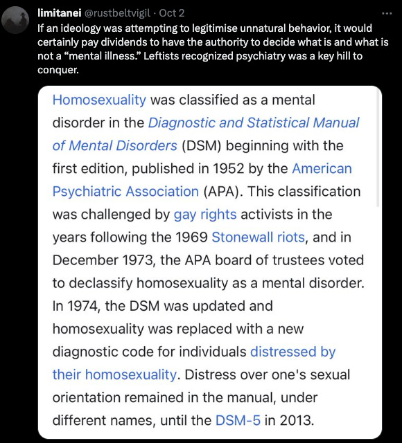 The antipsychiatry movement was founded by Marxists academics and today its seen as a largely right wing position, while most leftists are religiously pro-pharma. I shared this observation on Twitter and this reply pretty much nailed it.